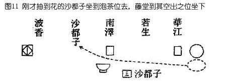 现在轮到沙都子泡茶了。她拿着替换牌,先伸出右脚,站起身来,走到泡茶位上去泡茶。此时,坐在临时位上的藤堂,便走到她留下的空位上坐下。