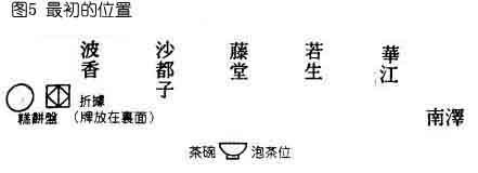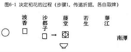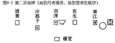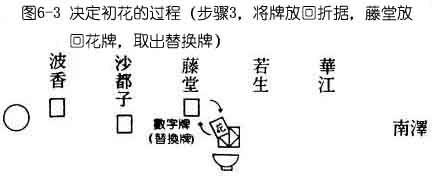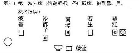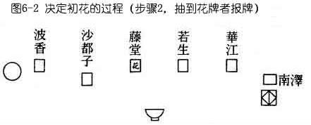第一回合的抽签,只能决定泡茶的人(花)是谁,吃糕饼的人(雪)和喝茶的人(月)还不能决定。因为还没有泡好的茶可以喝,所以第一回合抽签的目的就是要抽“花”而已,抽到的人称为“初花”。