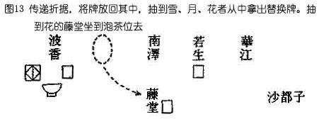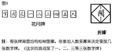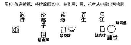 雅子一听,便将手中纸牌放回折据中,然后将折据依序往前传。拿到折据的人就将纸牌放入其中。传到藤堂手中时,依照规定,他除了必须将“花”牌放进去以外,还要从刚才雅子、华江、若生等三人放入的三张牌中,找出数字牌(一、二、三等)来,再从中抽取一张,拿在手里。这张牌也称为“替换牌”。有了替换牌,就不必参加下一回合的抽签,以免连续抽中“雪”、“月”、“花”,而使游戏过早结束。